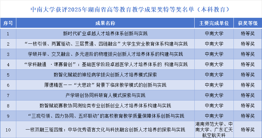 本網(wǎng)訊 日前,湖南省教育廳公布了2025年高等教育教學(xué)成果獎(jiǎng)獲獎(jiǎng)成果名單。中南大學(xué)共獲得教學(xué)成果獎(jiǎng)成果57項(xiàng),其中作為牽頭單位獲特等獎(jiǎng)12項(xiàng)、一等獎(jiǎng)23項(xiàng)、二等獎(jiǎng)20項(xiàng);以參與單位獲特等獎(jiǎng)1項(xiàng)、二等獎(jiǎng)1項(xiàng)。